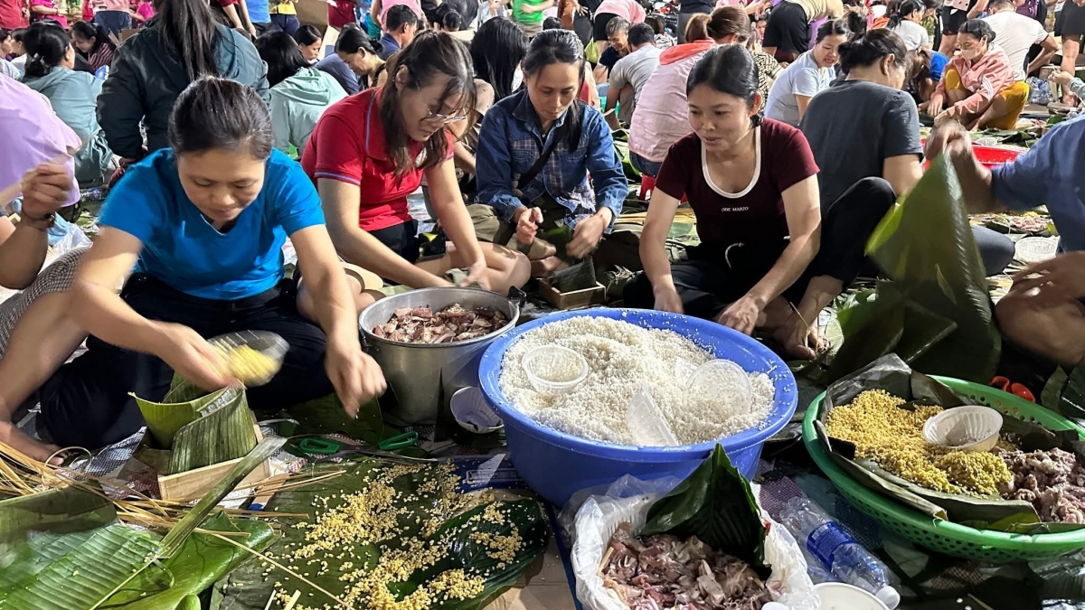 Mỗi người một việc, không khí gói bánh rất khẩn trương. Người được phân công vo gạo, tẩy vỏ đậu xanh, rửa lá dong, xắt thịt heo; những người khác cùng nhau gói bánh. Bánh gói đến đâu được chuyển ngay ra khu vực nấu với hơn 10 nồi cỡ lớn chờ sẵn. Toàn bộ gạo, thịt, đậu, lá dong, lá chuối đều được người dân quyên góp và cùng thực hiện.
