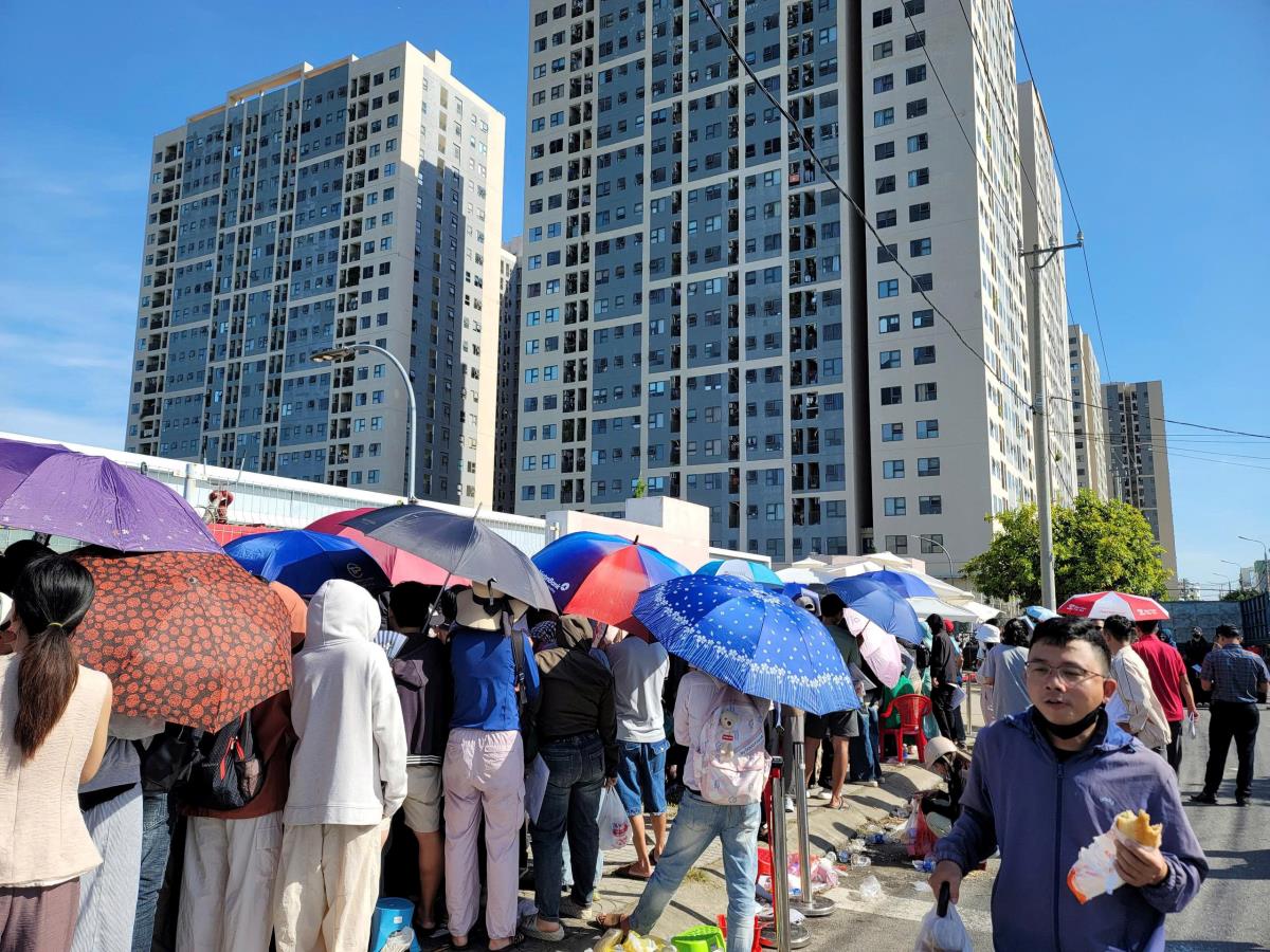 Người dân đội nắng xếp hàng chờ nộp hồ sơ mua nhà ở xã hội tại dự án Bàu Tràm Lakeside.