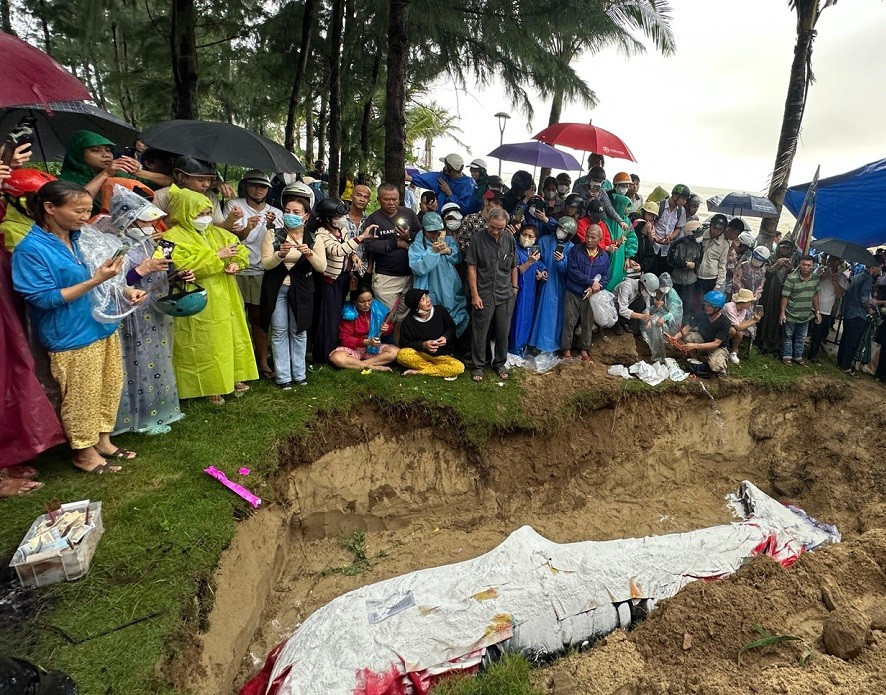 Sáng ngày 30/10, chính quyền phường Liên Chiểu đã phối hợp cùng các cơ quan chức năng và các vị cao niên trong làng biển tổ chức nghi thức an táng, đưa cá Ông lên bờ chôn cất theo phong tục địa phương, đồng thời triển khai các biện pháp đảm bảo vệ sinh môi trường.