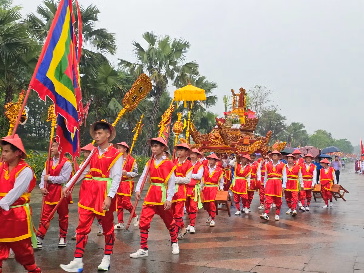 Từ khoảng 7h30, các đoàn rước bắt đầu khởi hành, tiến vào trung tâm lễ hội. Các kiệu lần lượt nối đuôi nhau di chuyển, tạo thành đoàn rước dài, trang nghiêm. Khi đến khu vực sân khấu, các đoàn tạm dừng, sắp xếp đội hình để biểu diễn.