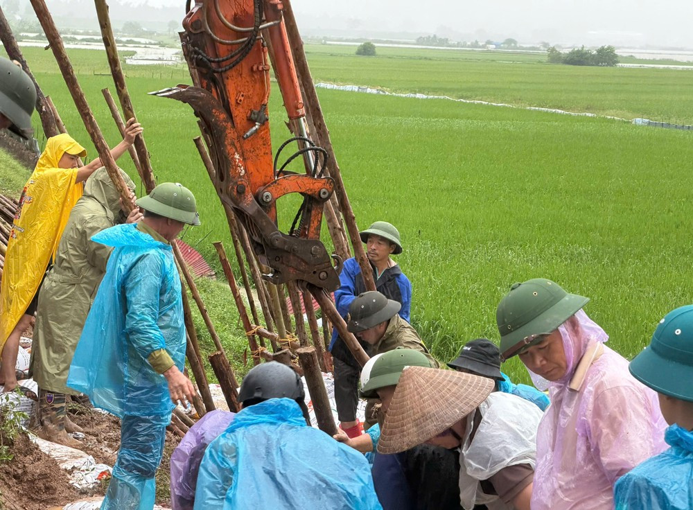 Cán bộ, chiến sĩ bộ đội, Công an, dân quân cùng người dân cùng nhau khắc phục đoạn đê bối bị sạt trượt đất.