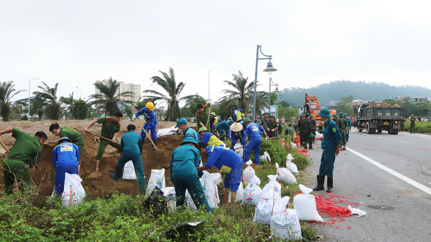 Hàng trăm khối đá hộc, đất và cát từ các khu vực lân cận đã được vận chuyển đến để gia cố. Trước mắt, lực lượng ứng cứu dùng xe cơ giới đổ đất, đá để bịt điểm vỡ, sau đó tiếp tục chèn bao cát và rọ đá.