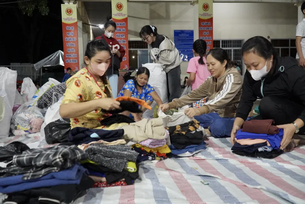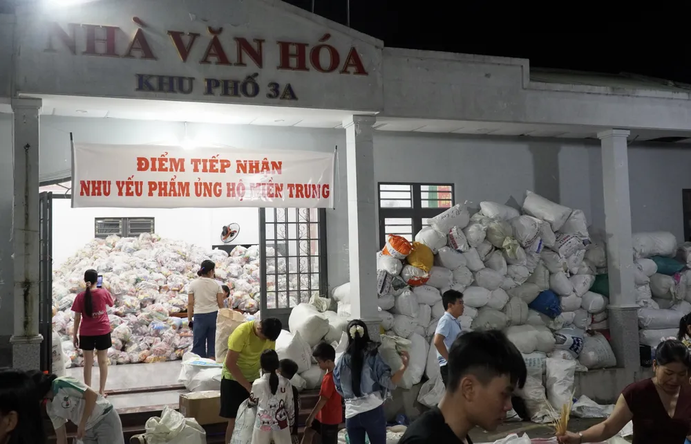 Từ tối 22 đến rạng sáng ngày 23-11, hàng trăm người dân ở phường Trảng Dài (tỉnh Đồng Nai) đã đến Nhà văn hóa của phường để gói bánh chưng, bánh tét, soạn quần áo, mì tôm, bánh kẹo…gửi ra cho đồng bào vùng lũ.