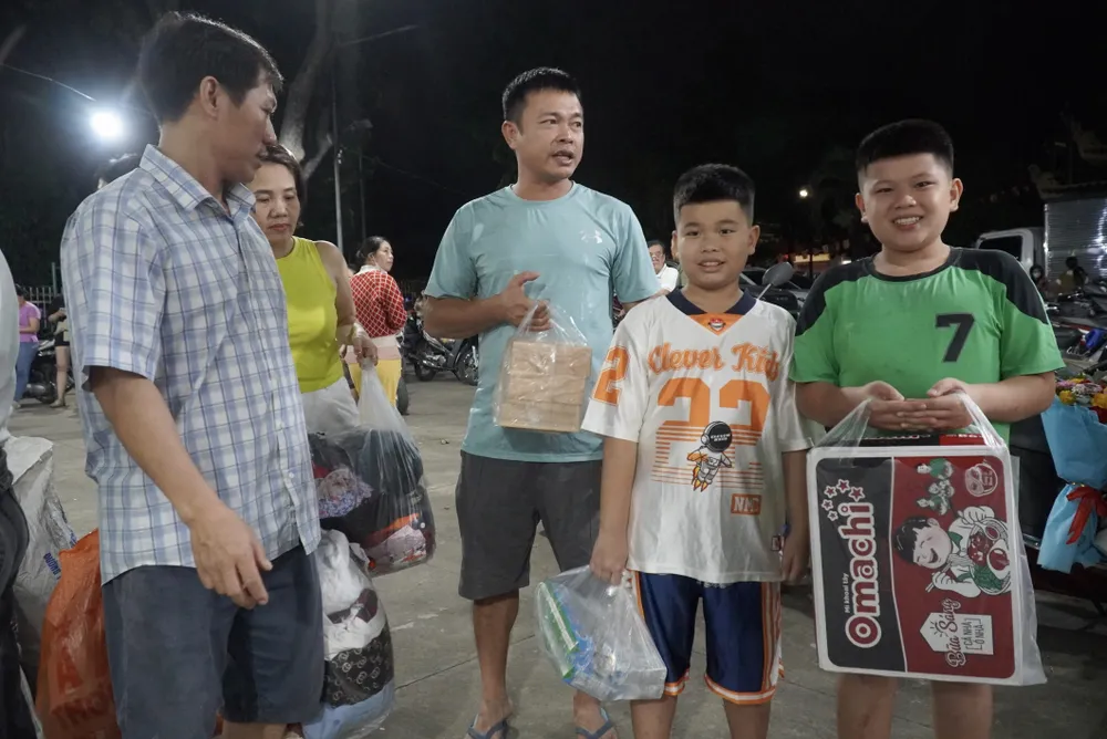 Trẻ em cùng ba mẹ mang mì tôm, sữa, quần áo đến điểm tiếp nhận để cùng chia sẻ những khó khăn với các bạn học sinh vùng ngập lụt...
