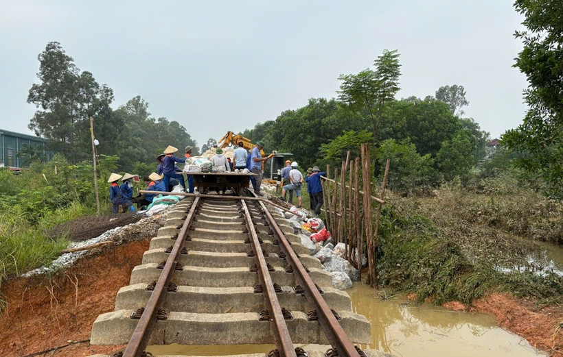 Để khắc phục vị trí này nhằm thông tuyến nhanh nhất, VNR đã vận chuyển đá hộc từ các mỏ đá đường sắt khu vực Đồng Mỏ, Thịnh Châu, Phúc Yên về đổ đá, thả rọ đá, lấp vào các điểm xói lở. Sau đó, các đơn vị sẽ sửa ray, thay tà vẹt để khôi phục khai thác tạm thời.