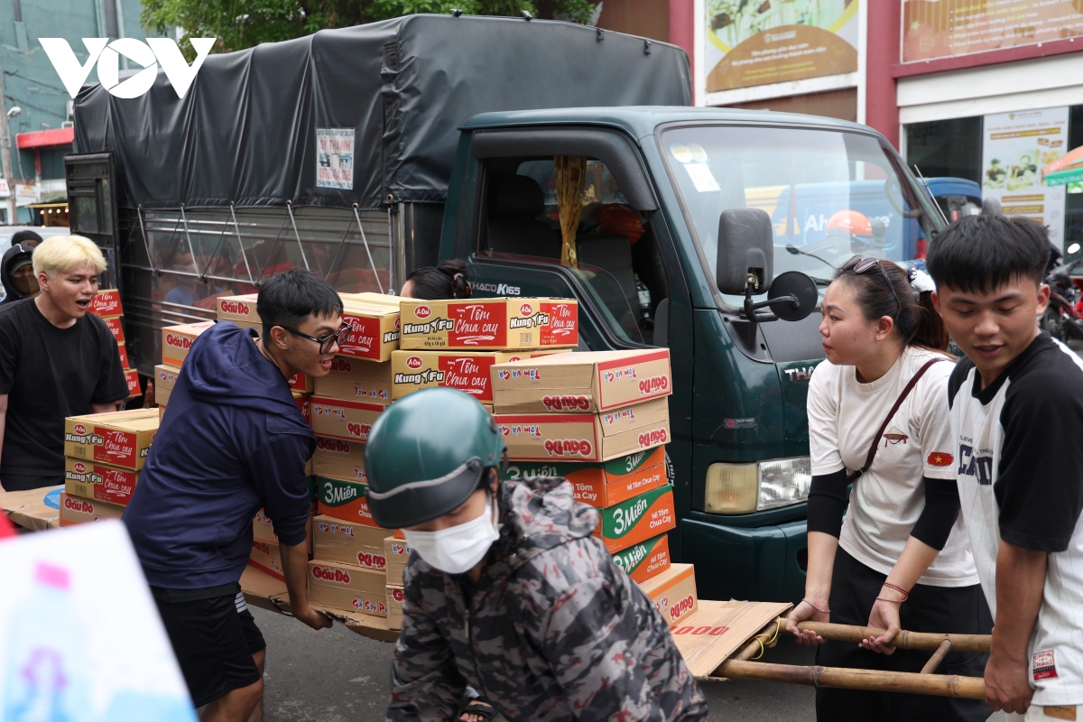 Tiếng xe cộ của người dân liên tục ra vào, chở theo những thùng sữa, mì gói, cá hộp cồng kềnh đến quyên góp. Hàng chục bạn trẻ tình nguyện viên phải luôn tay luôn chân hỗ trợ xuống hàng, rồi nhanh chóng chất vào kho, tạo nên một nhịp sống rộn ràng nhưng đầy yêu thương.