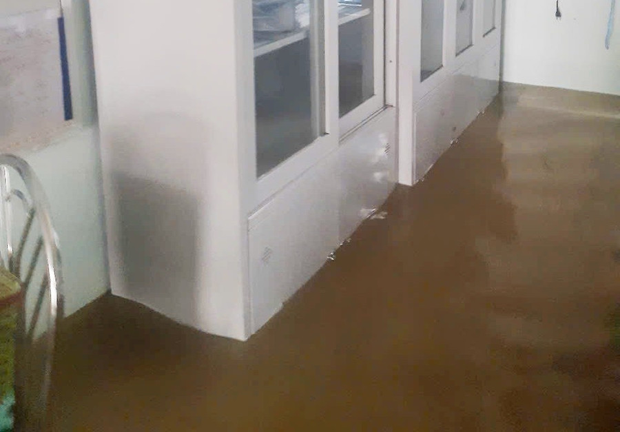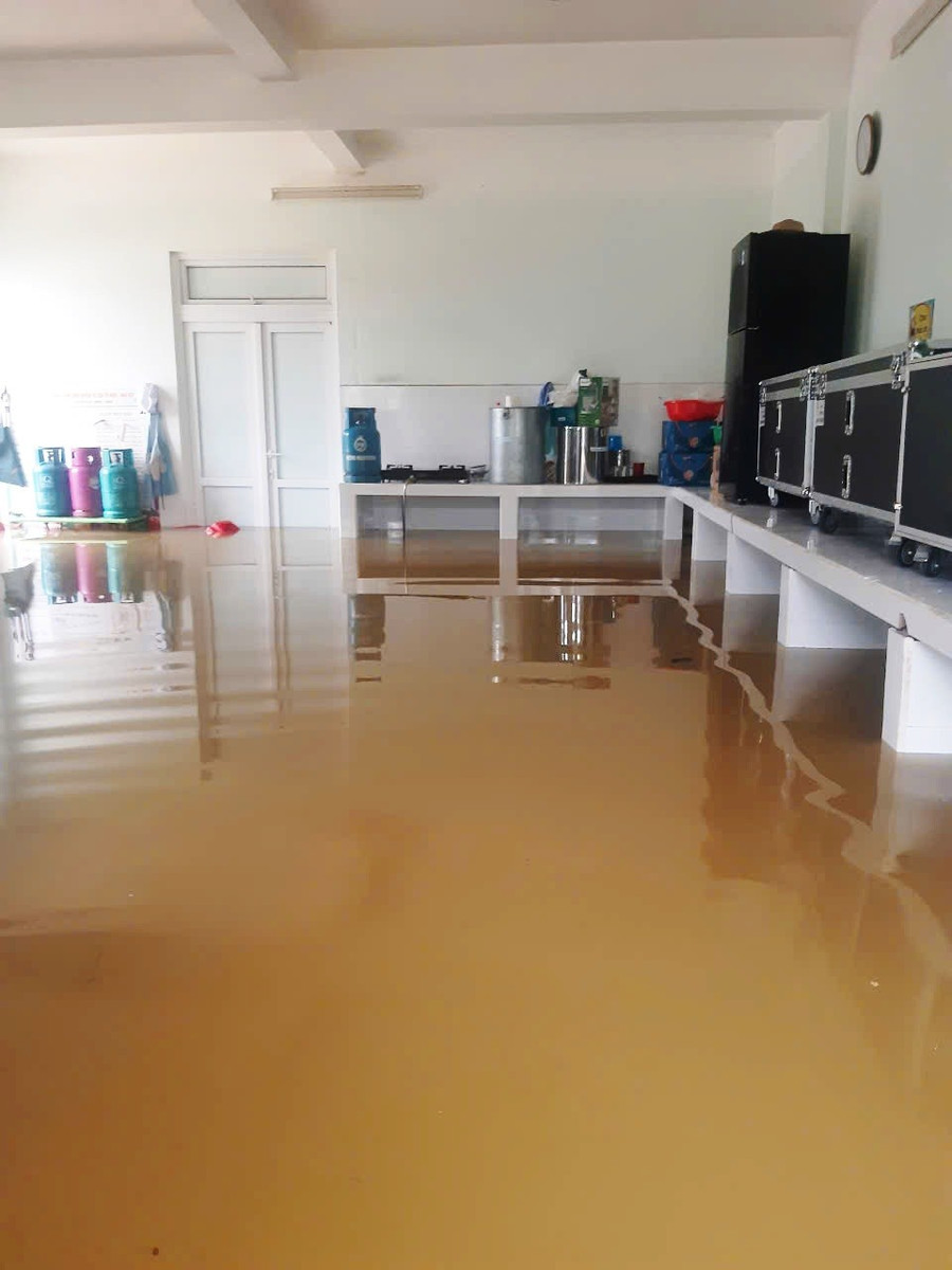 Nước lũ bủa vây khu vực bếp ăn Trường Mầm non Phú Mậu 1.