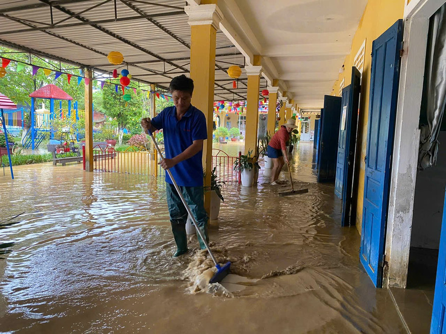 Một điểm trường Mầm non tại TP Huế tranh thủ dọn dẹp nước lũ trong sáng 29/10.