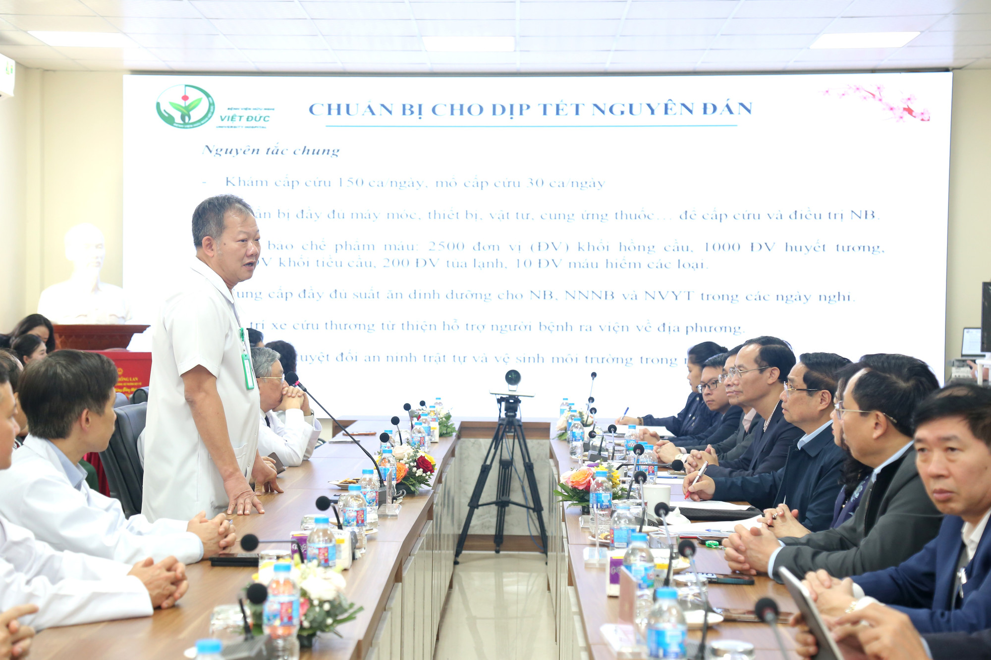 Báo cáo với Thủ tướng và đoàn công tác, Phó giáo sư Dương Đức Hùng - Giám đốc Bệnh viện Hữu nghị Việt Đức cho biết, số ca bệnh cấp cứu đến nhập viện chủ yếu trước Tết là sửa nhà, về quê đón Tết và sau ngày mùng 3 Tết- người dân đi chúc Tết nhiều. Do đặc thù là bệnh viện tuyến cuối về ngoại khoa, nên bắt đầu từ chiều nay bệnh nhân nặng ở các tuyến sẽ chuyển lên.