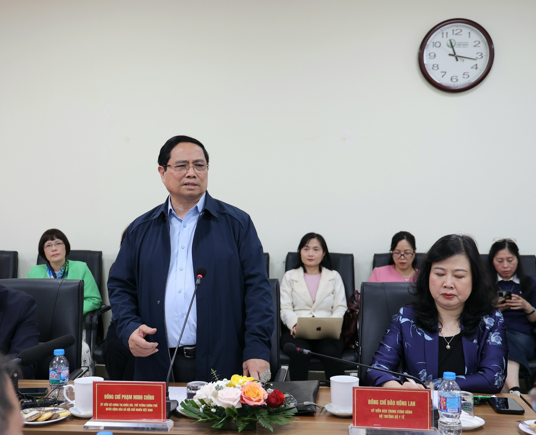 Thủ tướng Chính phủ Phạm Minh Chính và đoàn công tác của Bộ Y tế làm việc tại Bệnh viện Hữu nghị Việt Đức. (Ảnh: PV/Vietnam+)