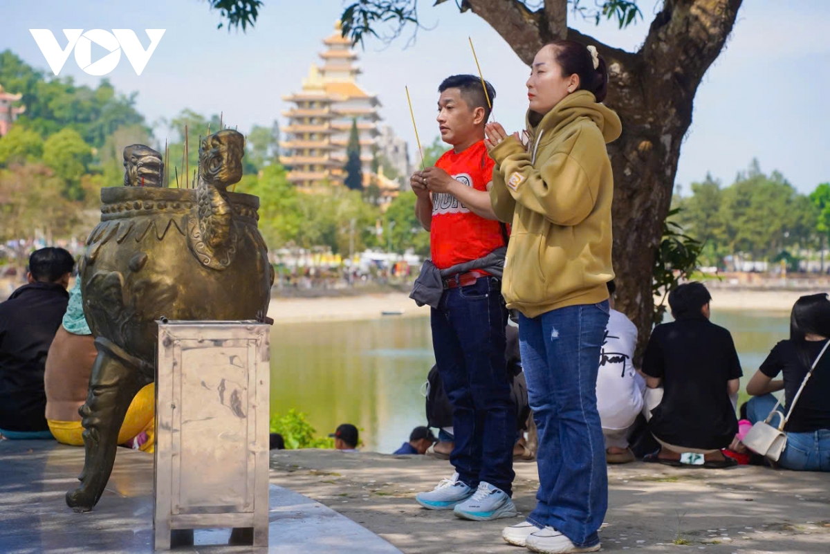 Khu vực Hồ Thủy Liêm và Chùa Phật Lớn là nơi tập trung đông đảo người dân, du khách. Mọi người dừng chân vãn cảnh, tận hưởng không khí thanh tịnh giữa núi rừng.