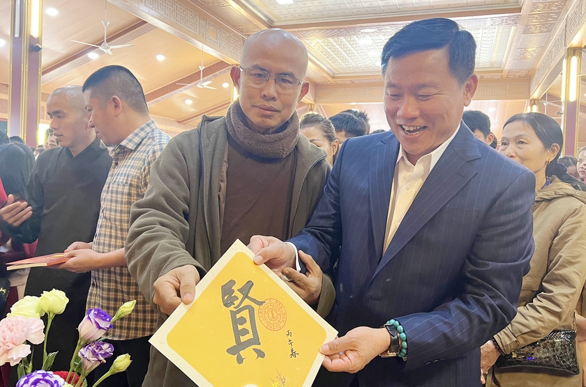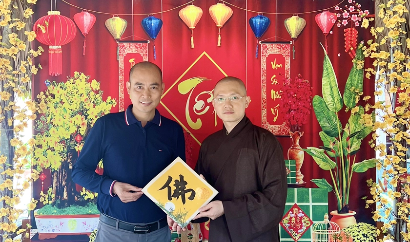 Đại đức Thích Định Tuệ - Trụ trì Chùa Đức Hậu tặng chữ cho ông Hoàng Phú Hiền - Phó Chủ tịch Ủy ban nhân dân tỉnh Nghệ An đầu năm mới. Ảnh: Quốc Huy