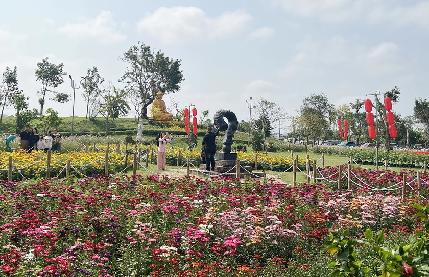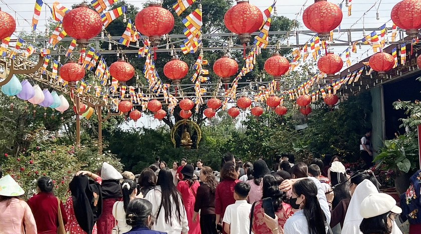 Ghi nhận của phóng viên, tại chùa Đức Hậu, phường Vinh Phú, tỉnh Nghệ An, hàng ngàn người đã đến chùa tụng kinh, niệm Phật và chiêm bái cảnh quan yên bình có nhiều loài hoa khoe sắc đầu xuân.