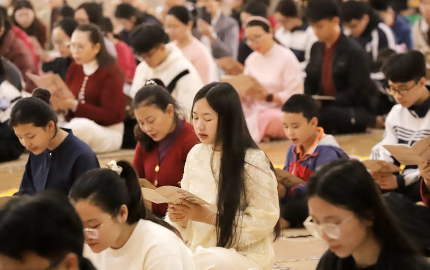 Phật tử chăm chú đọc kinh niệm Phật trong buổi lễ. Ảnh: Quốc Huy