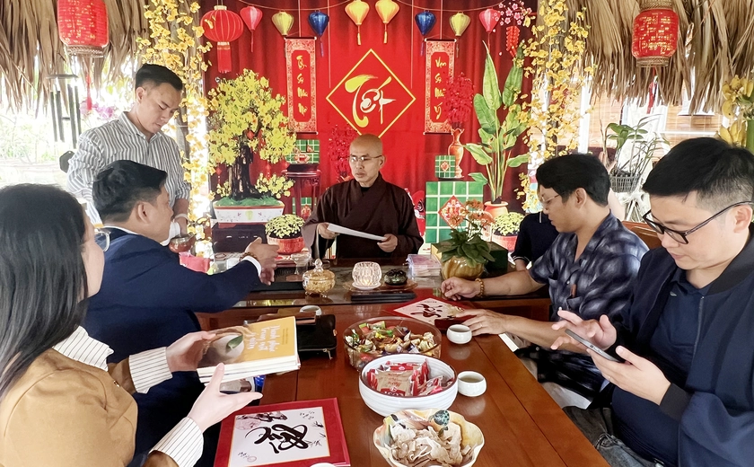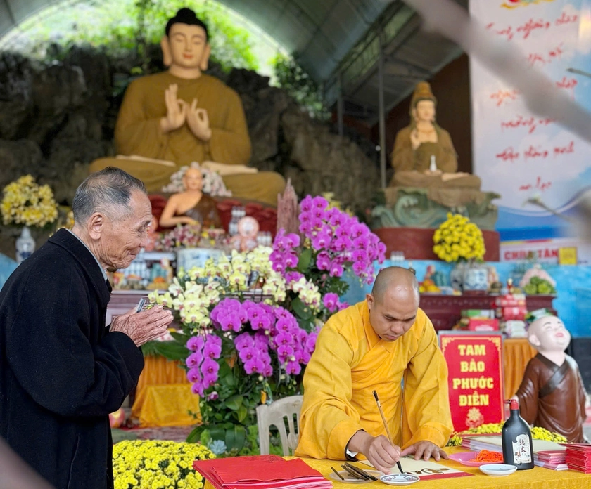 "Trong không khí thanh tịnh đầu năm, đại chúng đồng tụng kinh, niệm Phật, chí thành cầu nguyện cho đất nước thái bình, nhân dân an lạc, mưa thuận gió hòa. Nghi thức khai bút được cử hành trang trọng, gửi gắm ước nguyện khơi mở trí tuệ, phát tâm tu học và làm nhiều việc thiện trong năm mới" - Đại đức Thích Đồng Tuệ gửi gắm.