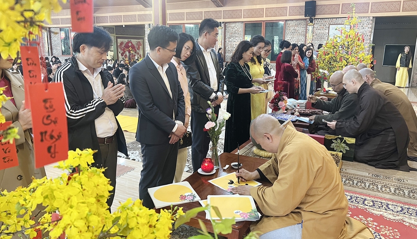 Rất nhiều các phật tử là giáo viên, phụ huynh đến chùa xin chữ đầu năm. Ảnh: Quốc Huy
