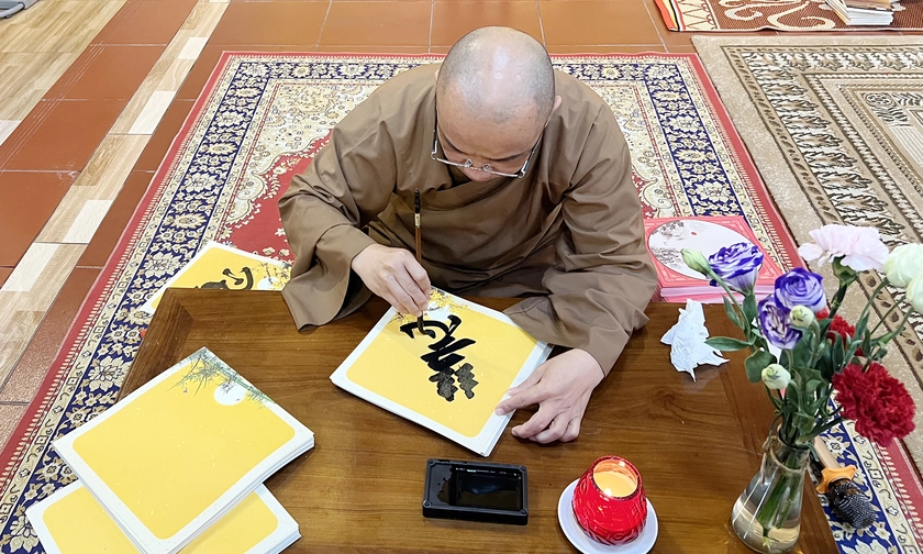 Thầy đang họa chữ cho các phật tử. Ảnh: Quốc Huy
