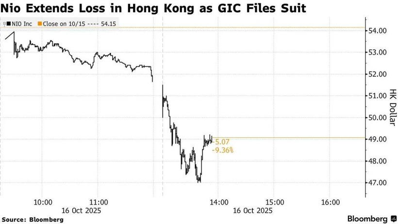 Ngày 16/10 cổ phiếu hãng xe điện NIO (Trung Quốc) đột ngột lao dốc trên cả 3 sàn giao dịch. Tại sàn Hồng Kông, giá cổ phiếu NIO có lúc giảm tới 13%; tại Singapore, mất 10,2%. Còn tại Mỹ, giao dịch ngoài giờ đêm 15/10 cũng giảm hơn 10%.