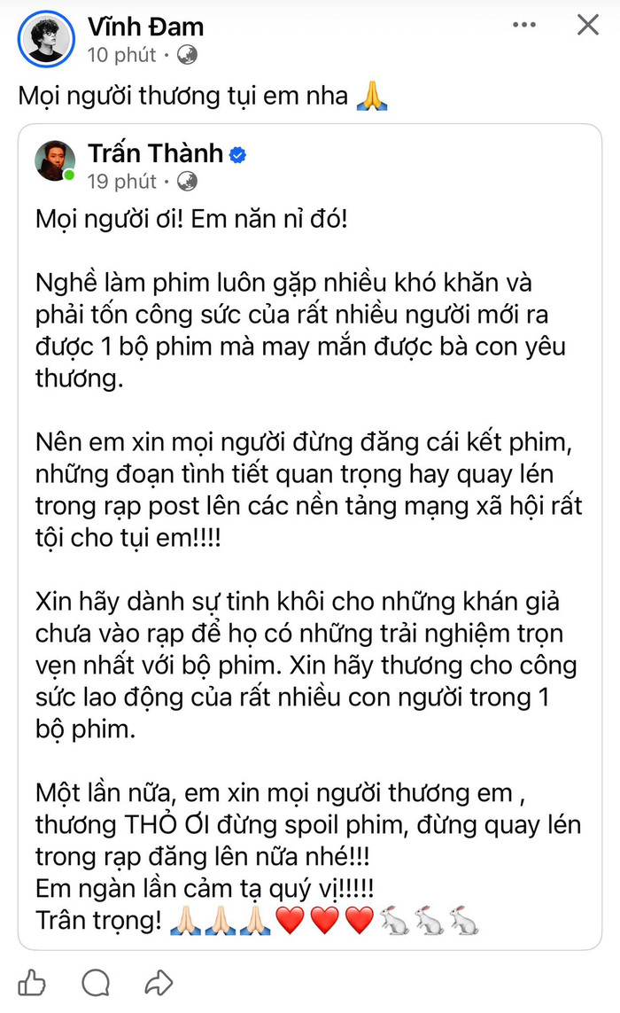 Cụ thể, trên trang cá nhân, Vĩnh Đam đăng tải lại bài viết của Trấn Thành kèm theo dòng chia sẻ ngắn gọn: "Mọi người thương tụi em nha" cùng biểu tượng chắp tay cầu xin. Dù chỉ là một câu nói súc tích, nhưng thông điệp mà nam diễn viên gửi gắm lại mang nhiều tầng ý nghĩa, đó là lời kêu gọi xuất phát từ vị trí của người trực tiếp đứng trước ống kính, đồng thời cũng là tiếng nói đại diện cho công sức tập thể phía sau một bộ phim điện ảnh.