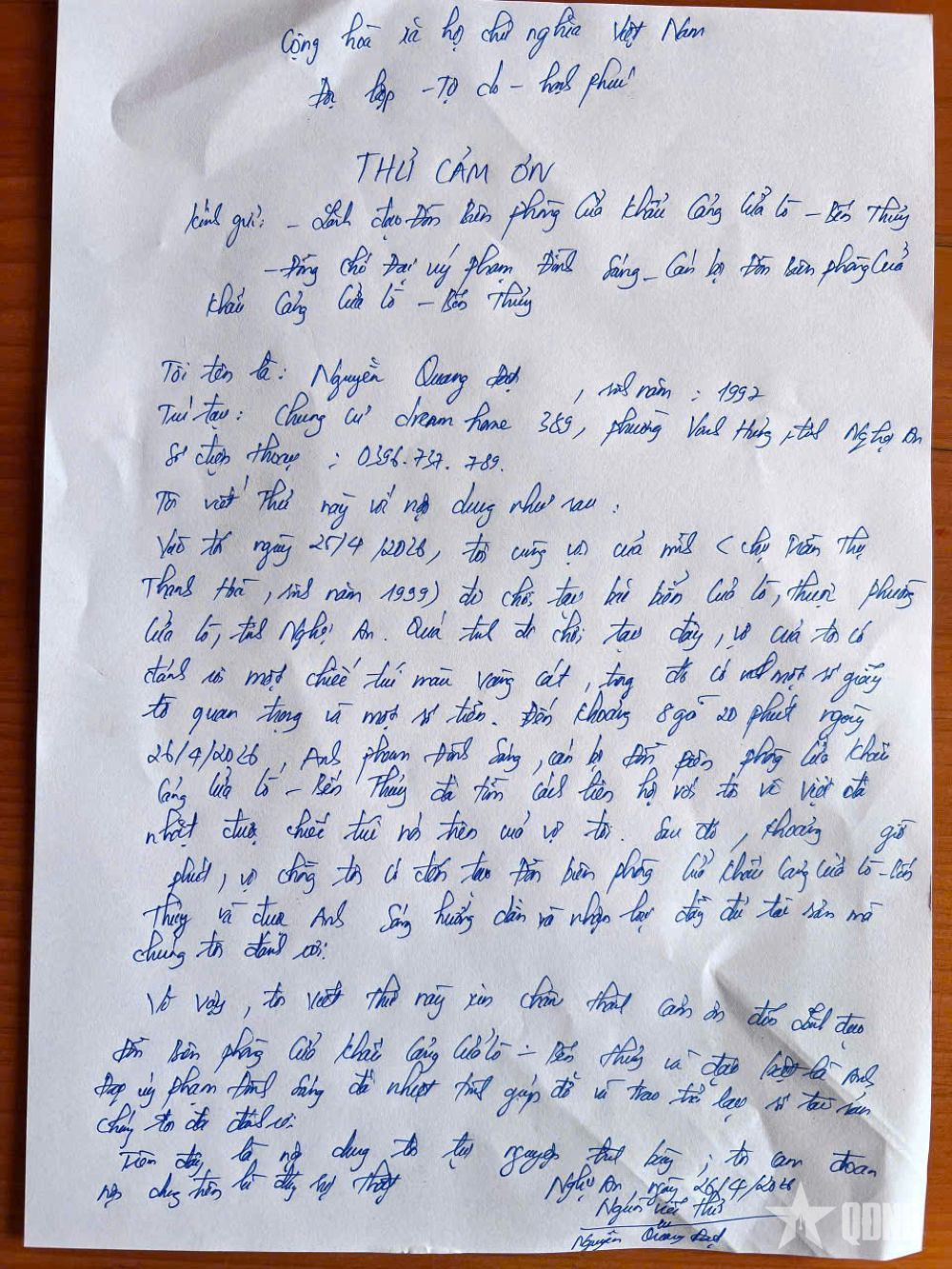 Thư cảm ơn của người được Đại úy Phạm Đình Sáng trả lại tài sản đã mất.