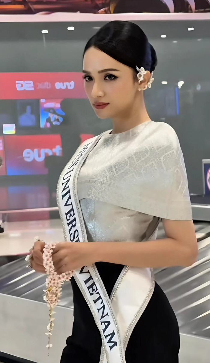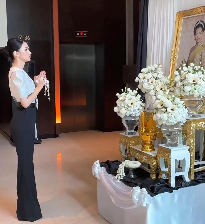Một chi tiết đáng chú ý là ngay khi đặt chân đến “xứ sở chùa Vàng”, người đẹp lập tức thể hiện sự thành kính trước hình ảnh của Vương Thái hậu Sirikit. Hành động này được đánh giá là tinh tế, thể hiện sự tôn trọng văn hóa và người dân nước bạn.