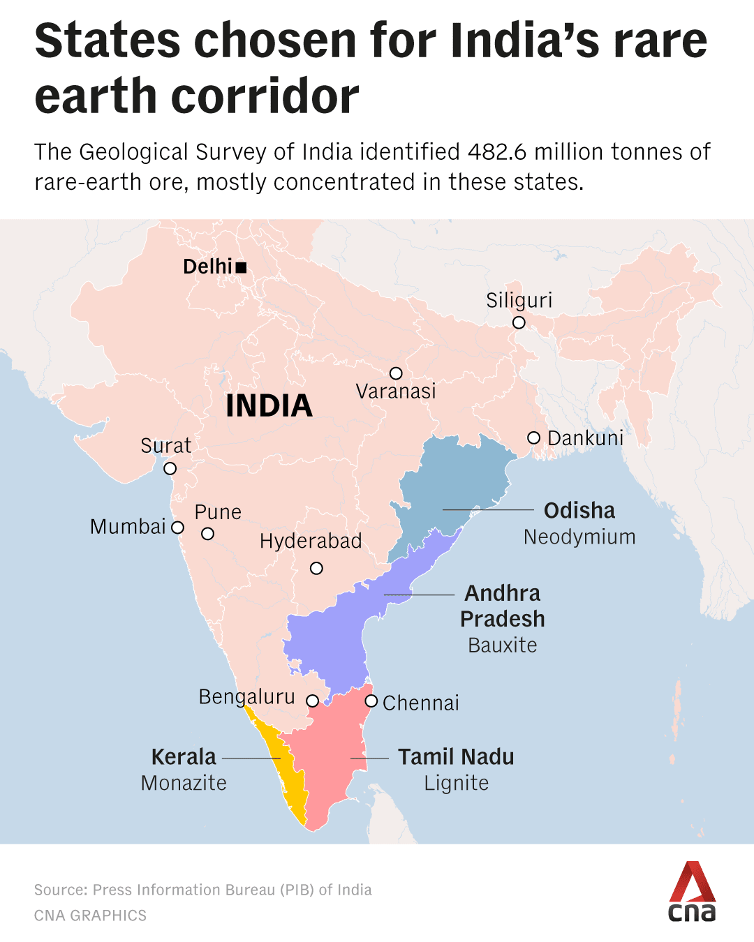 Các bang được chọn tham gia Hành lang khai thác đất hiếm của Ấn Độ đã được công bố trong Ngân sách Liên bang năm 2026-2027. Ảnh: CNA/Rafa Estrada