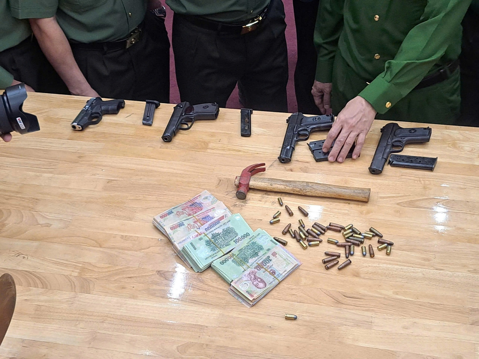 Khám xét nơi ở của các đối tượng, cơ quan điều tra thu giữ 4 khẩu súng ngắn (chưa xác định chủng loại), 46 viên đạn, khoảng 1kg đạn chì, khoảng 930 triệu đồng tiền mặt, 2 nhẫn vàng cùng nhiều đồ vật, tài liệu liên quan.