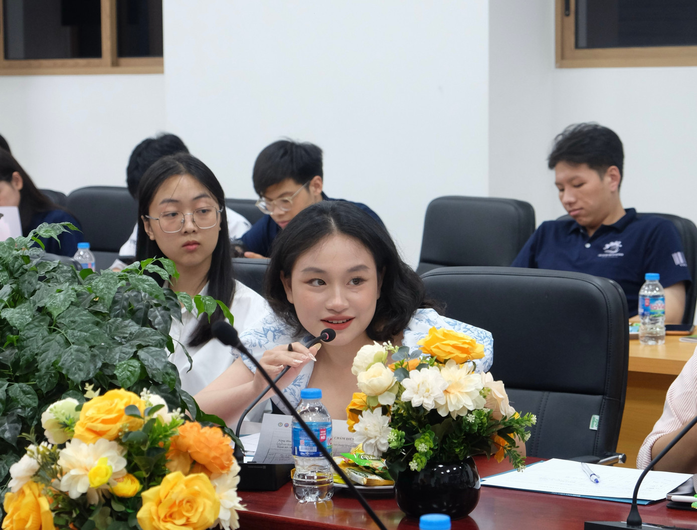Nữ sinh làm Ban giám khảo trong một cuộc thi về tranh biện cho sinh viên tại Học viện Tài chính.