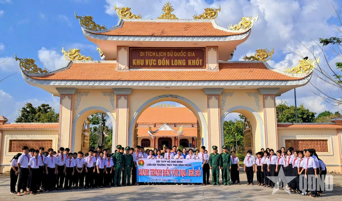Các đại biểu và học sinh nghe giới thiệu lịch sử hình thành, ý nghĩa, giá trị của Khu di tích lịch sử quốc gia khu vực Đồn Long Khốt.