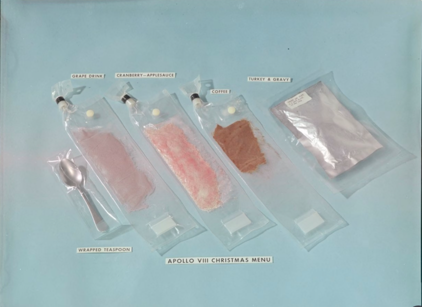 Thực đơn Giáng sinh trên tàu Apollo 8 năm 1968 bao gồm nước nho sấy khô, sốt táo cranberry và cà phê, cũng như một gói đồ ăn ướt chứa gà tây và nước sốt. Ảnh: Nasa.gov