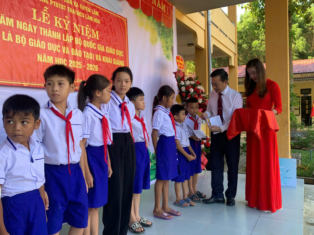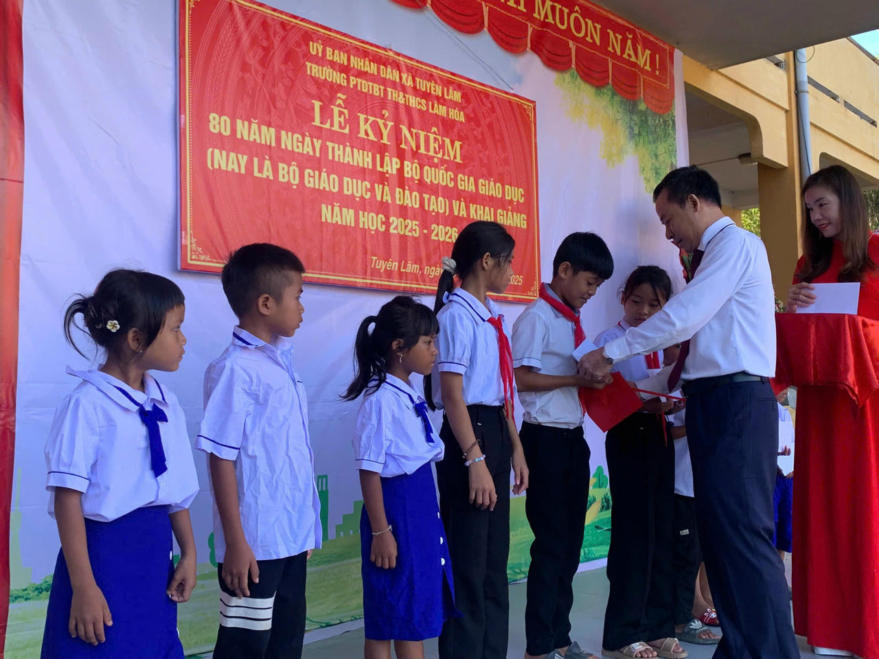 Ông Đinh Xuân Thương, Bí thư Đảng ủy, Chủ tịch UBND xã Tuyên Lâm trao thưởng cho các em học sinh.