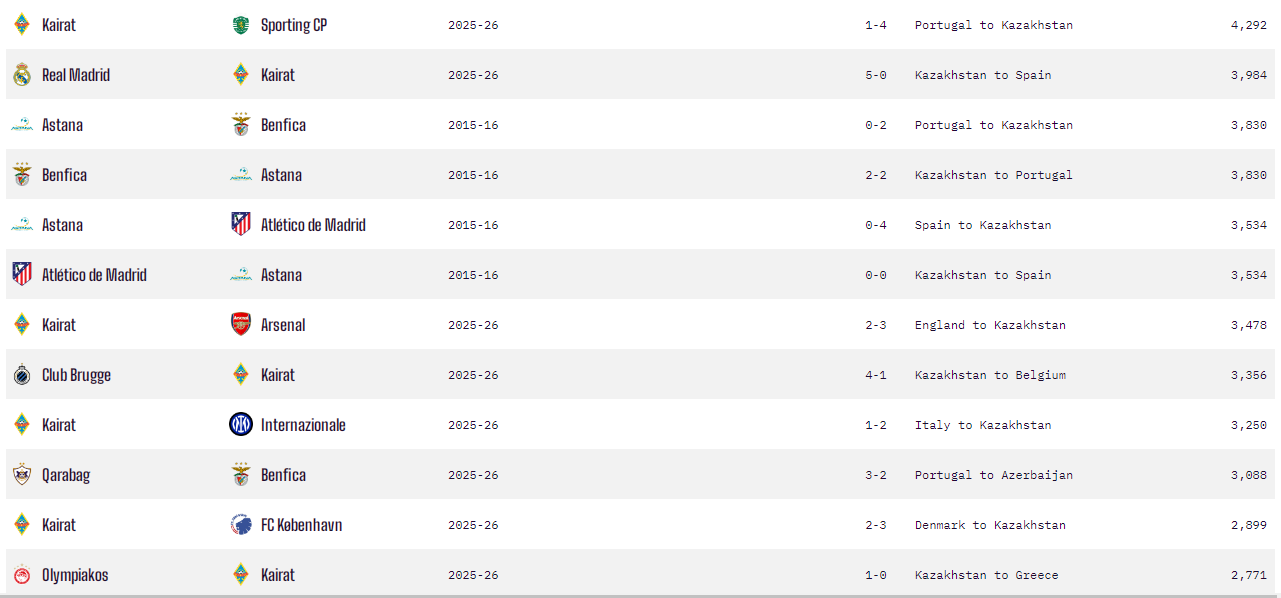 Theo phân tích từ Opta Analyst, hành trình này xếp thứ 17 trong danh sách các chuyến đi dài nhất lịch sử Champions League. Tất cả các vị trí hàng đầu đều liên quan đến các đội từ Azerbaijan, như Qarabag hoặc Kazakhstan như Astana và Kairat – những quốc gia nằm ở rìa châu Âu hoặc có thể xem là vực Trung Á. Ví dụ như Kairat có trụ sở tại thành phố Almaty, không xa biên giới với Trung Quốc, vì vậy không ngạc nhiên khi họ là đội bóng xa nhất khỏi châu Âu lục địa từng thi đấu ở Champions League. Mùa này là lần đầu tiên họ tham gia giải đấu, và đã lập kỷ lục khi di chuyển 6.906 km đến Lisbon để đấu Sporting CP. Bảy trong tám trận của họ nằm trong top 12 hành trình dài nhất, chứng tỏ mùa 2025-26 là năm của những cuộc chinh phục địa lý.