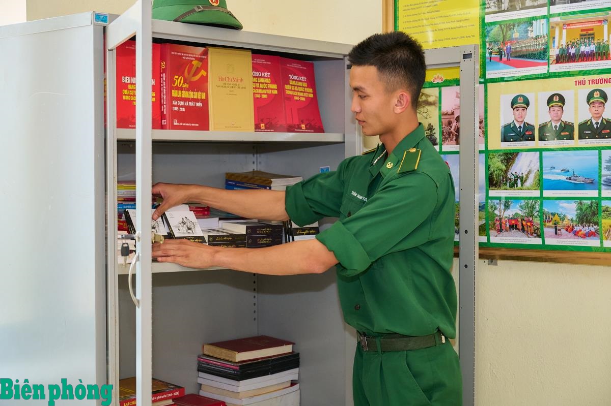 Chiến sĩ Đồn Biên phòng Ka Lăng hào hứng sắp xếp lại tủ sách đơn vị. Ảnh: Xuân Trường