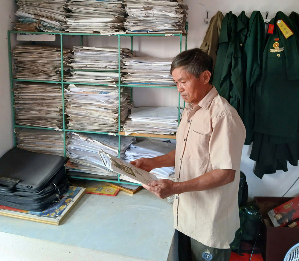Cựu chiến binh Cao Việt Đức bên kho tài liệu về các liệt sĩ.