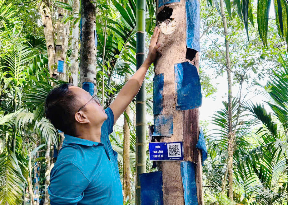 Bắt đầu nghiên cứu trầm hương từ năm 2021, anh Thạnh theo đuổi phương pháp cấy men vi sinh tự nhiên trên cây dó bầu. Sau thời gian học tập mô hình thí điểm ở Đồng Nai, anh triển khai thử nghiệm tại xã Lãnh Ngọc, theo dõi liên tục trong 2 năm trước khi đầu tư mở rộng.