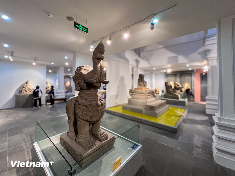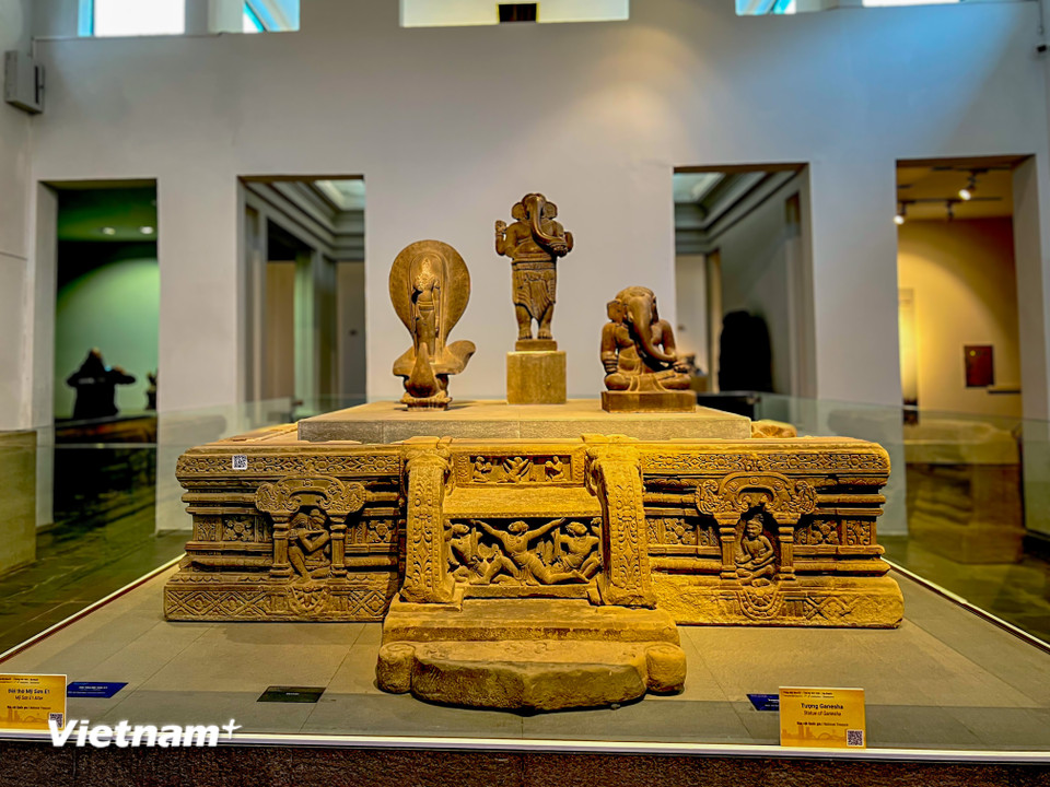 Sự kết hợp độc đáo giữa Đài thờ Mỹ Sơn E1 và các tượng Ganesha, tạo nên một quần thể tâm linh trang nghiêm trong lòng bảo tàng. (Ảnh: Thanh Phong/Vietnam+)