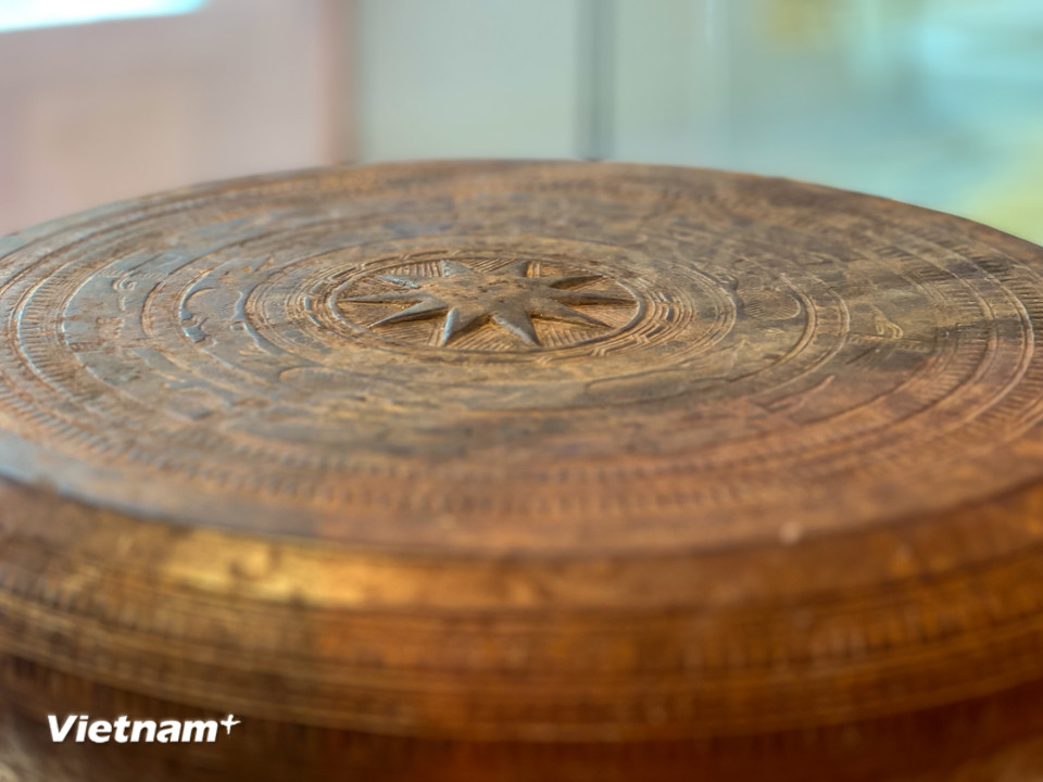 Những hoa văn hình học và ngôi sao nhiều cánh trên mặt trống đồng Đông Sơn, biểu tượng của văn minh lúa nước và quyền lực thời đại. (Ảnh: Thanh Phong/Vietnam+)
