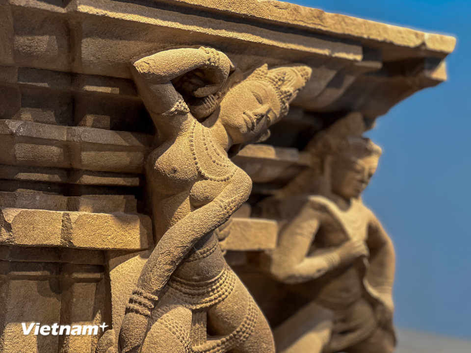 Cận cảnh nét cười và tư thế múa mềm mại của các vũ nữ Apsara, đỉnh cao của phong cách nghệ thuật Trà Kiệu thế kỷ X. (Ảnh: Thanh Phong/Vietnam+)