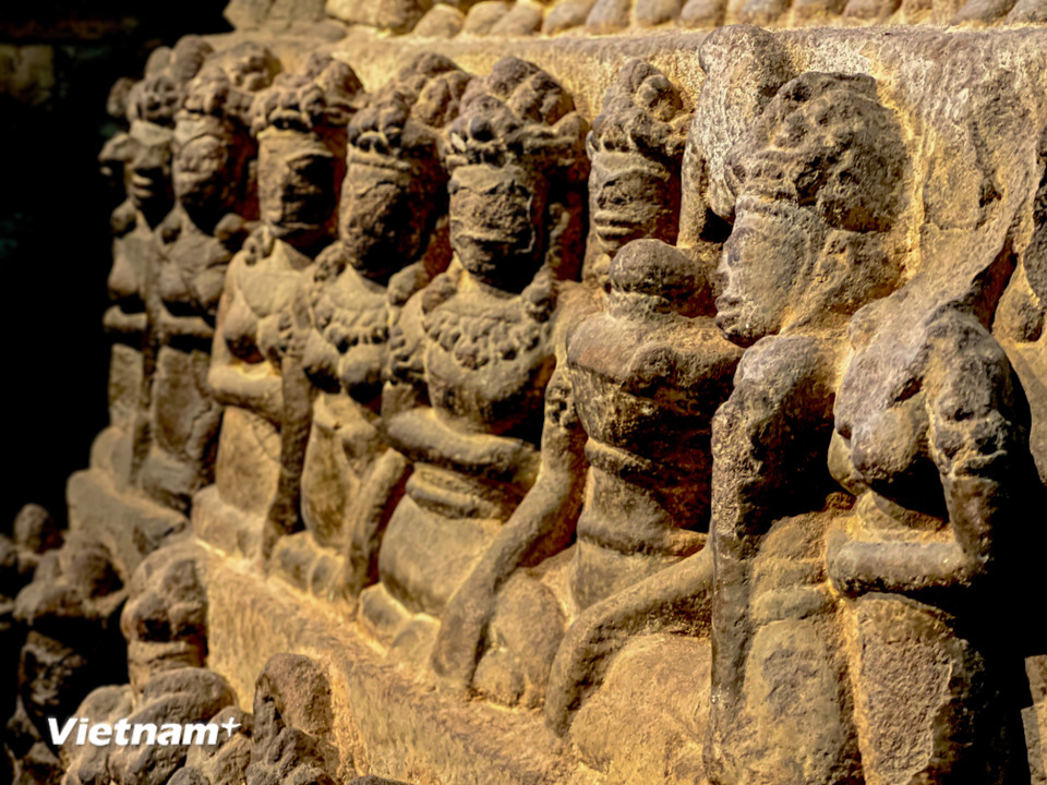 Những đường nét chạm khắc tỉ mỉ trên chân đài thờ Đồng Dương, tái hiện đời sống với các nhạc công và vũ nữ. (Ảnh: Thanh Phong/Vietnam+)