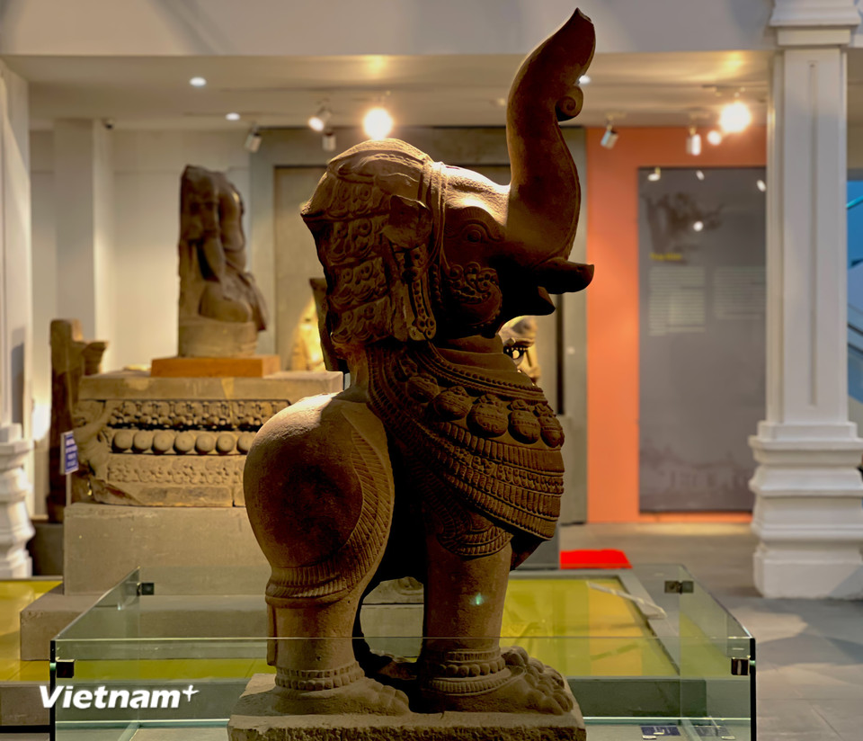 Tượng Gajasimha - linh vật voi sư tử với kích thước đồ sộ, đóng vai trò canh giữ và bảo vệ các công trình kiến trúc linh thiêng. (Ảnh: Thanh Phong/Vietnam+)