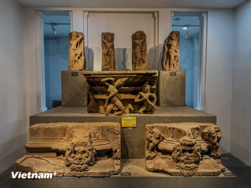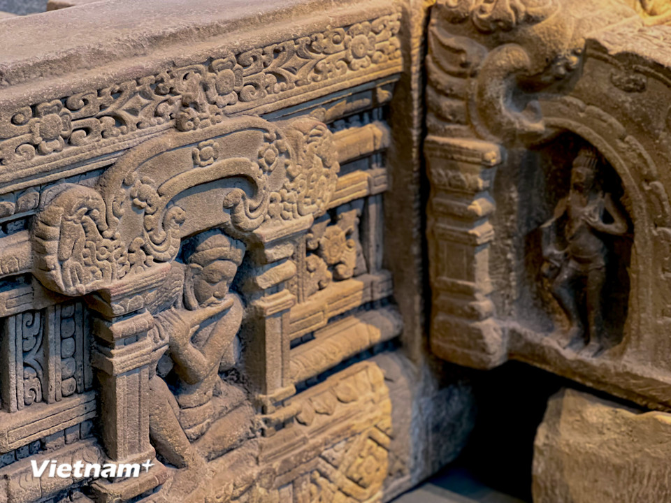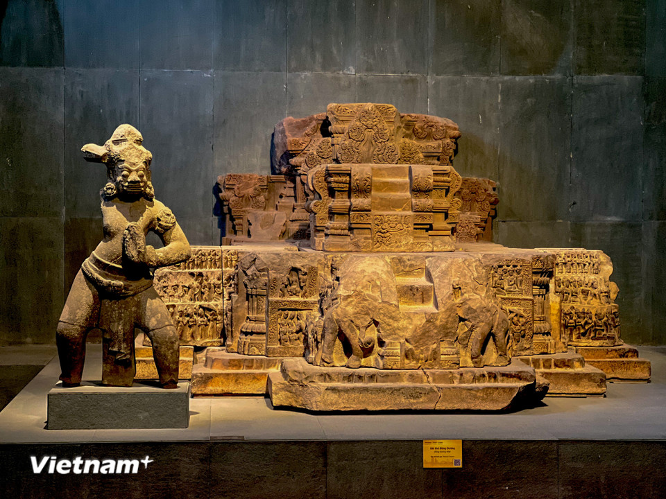 Đài thờ Đồng Dương - tâm điểm của triển lãm, một kiệt tác sa thạch thế kỷ thứ IX phản ánh sự phát triển rực rỡ của Phật giáo Champa. (Ảnh: Thanh Phong/Vietnam+)