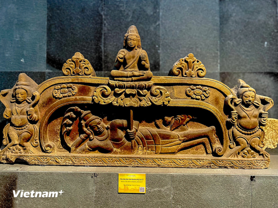 Phù điêu Đản sinh thần Brahma từ tháp Mỹ Sơn E1, một trong những bức chạm khắc quan trọng bậc nhất minh họa điển tích Hindu giáo. (Ảnh: Thanh Phong/Vietnam+)