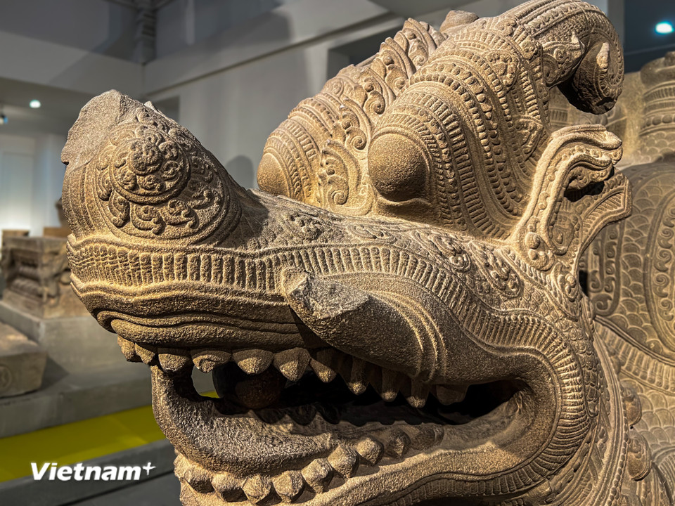 Từng đường nét uốn lượn và hoa văn trang trí tinh tế trên đầu linh vật Gajasimha qua góc chụp cận cảnh. (Ảnh: Thanh Phong/Vietnam+)
