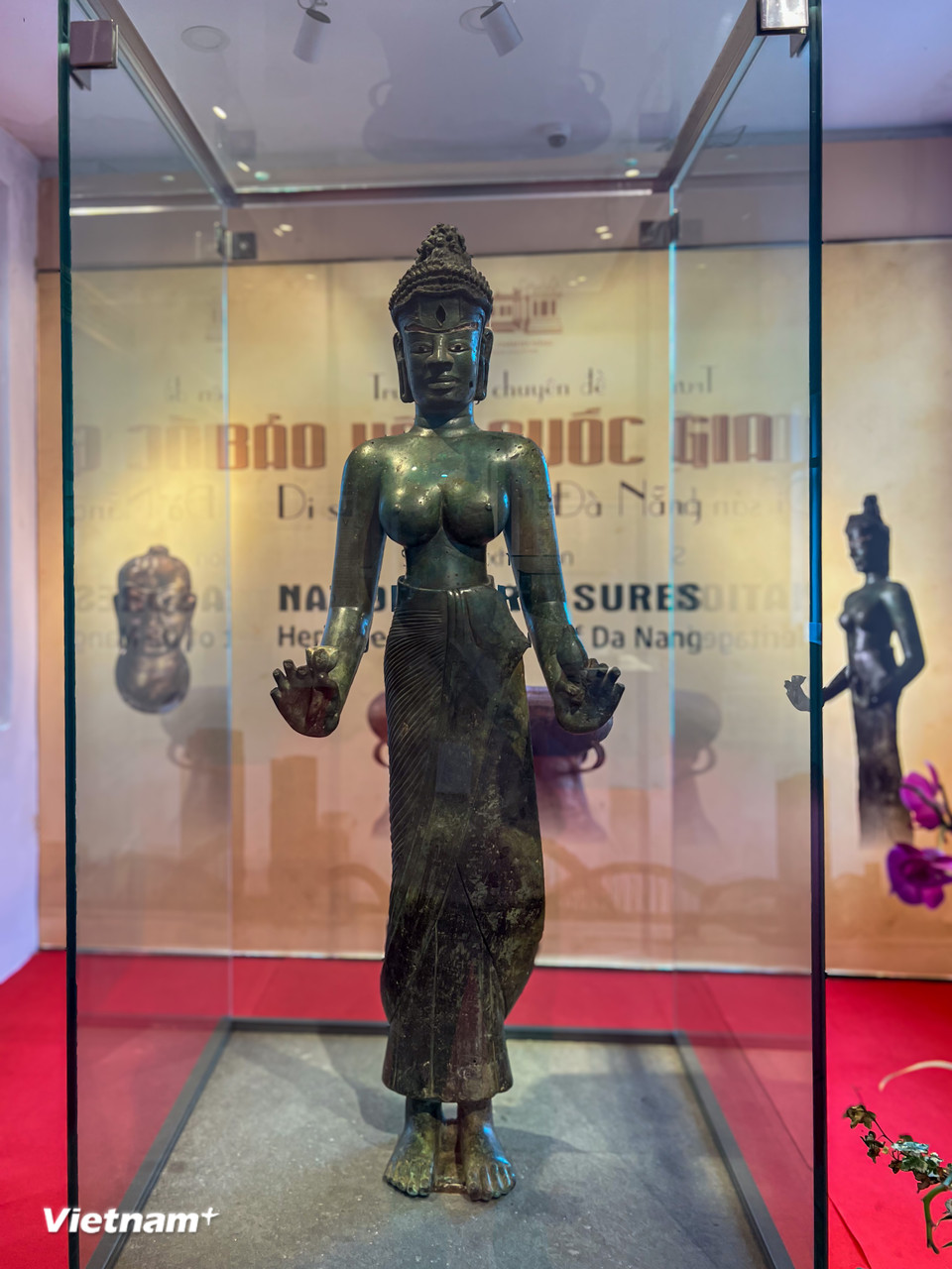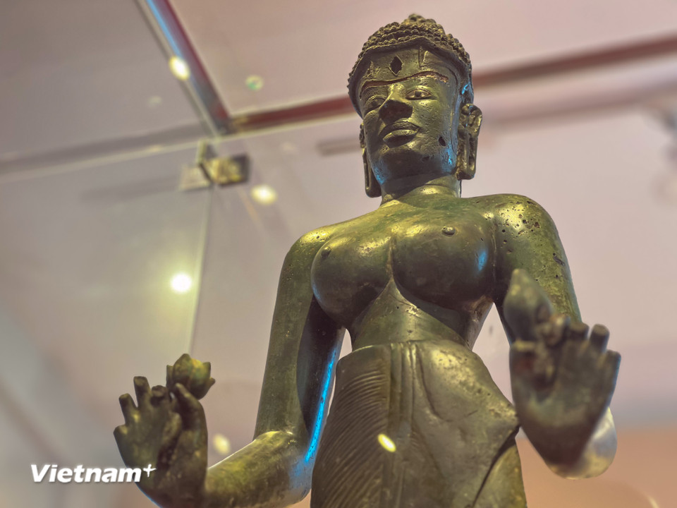 Tượng Bồ tát Tara - "nàng Mona Lisa" của nghệ thuật Champa, bảo vật bằng đồng nguyên bản được trưng bày trong không gian đặc biệt. (Ảnh: Thanh Phong/Vietnam+)
