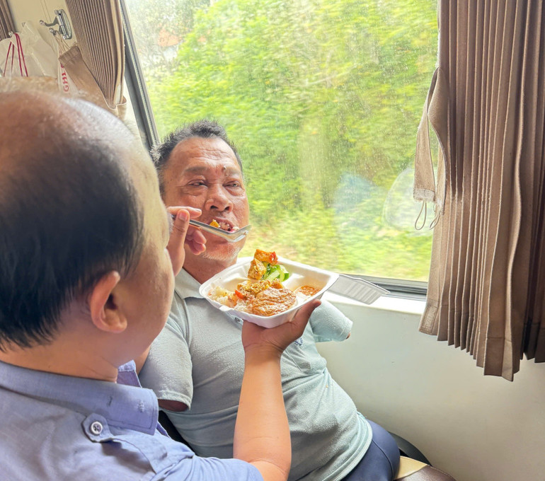 Ngay từ giây phút đầu tiên tại ga Vinh, các nhân viên đường sắt, dù trên tàu hay dưới ga đã chủ động phối hợp để bế anh lên tàu một cách an toàn và nhẹ nhàng nhất. Suốt nhiều giờ đồng hồ trên hành trình hướng về phương nam, tổ tàu SE3 đã thực sự trở thành những người bạn đồng hành thân thiết nhất của anh. Từ việc hỗ trợ những nhu cầu sinh hoạt cá nhân cho đến từng thìa cơm, ngụm nước trong mỗi bữa ăn, nhân viên đường sắt đã phục vụ bằng một sự kiên nhẫn và lòng trắc ẩn đáng khâm phục.