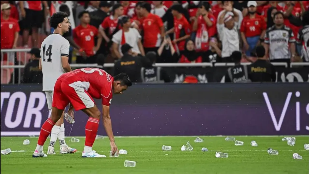 Khi tiếng còi kết thúc trận vang lên của trọng tài Ma Ning, hàng trăm fan Indonesia bực tức ném ly nhựa xuống sân. Trận Indonesia- Iraq có rất nhiều fan của hai đội đến xem.