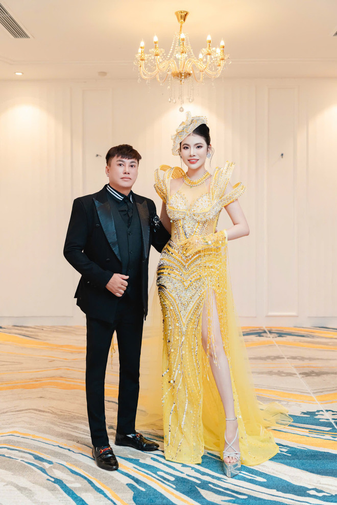 Trong khi đó, bộ đầm “vedette” với phom dáng tôn đường cong, chất liệu satin phối organza cao cấp và phụ kiện ánh kim giúp Kimmie Lê toát lên vẻ đẹp quyền lực và thanh lịch.