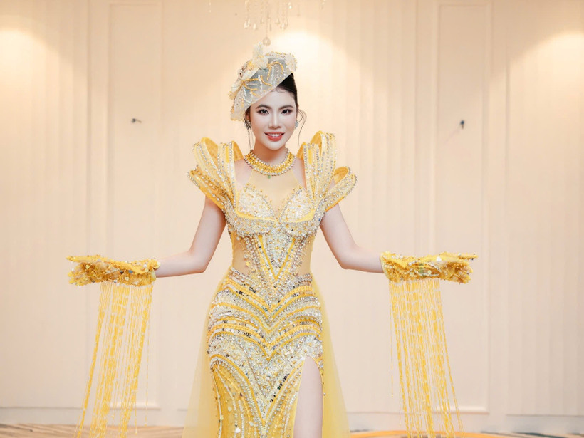 Bộ “first face” mang sắc vàng ánh kim được đính kết thủ công bằng pha lê Swarovski, đá quý và chi tiết ren viền tinh xảo, tạo hiệu ứng phản chiếu rực rỡ dưới ánh đèn sân khấu. Điểm nhấn là cấu trúc nón đội và áo choàng xếp tầng thể hiện tinh thần Á đông hiện đại, vừa mềm mại vừa kiêu hãnh.