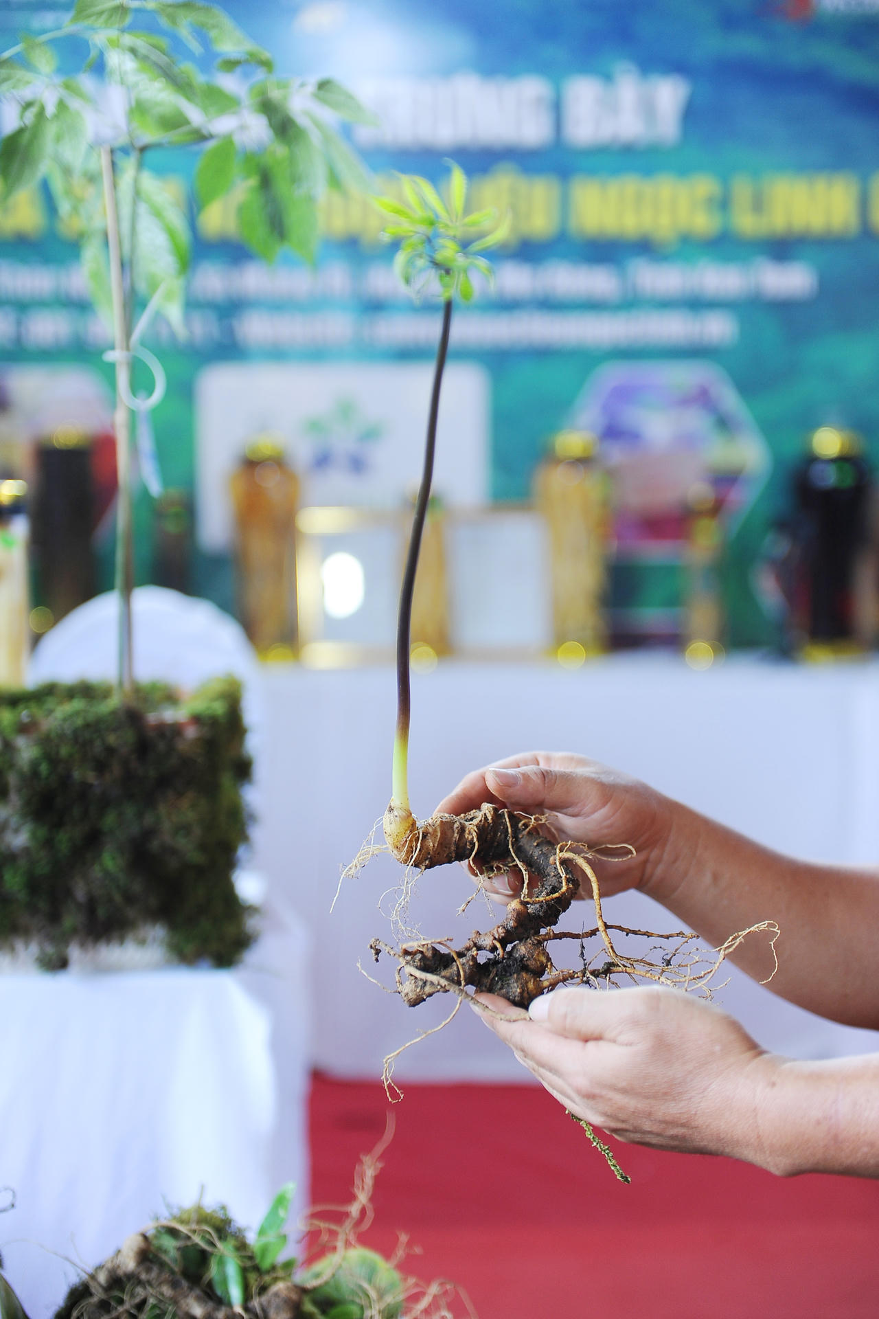 Củ sâm Ngọc Linh 10 năm tuổi chính hiệu có giá trị kinh tế cao được người dân đem đến trưng bày tại một gian hàng hội chợ giới thiệu sản phẩm.