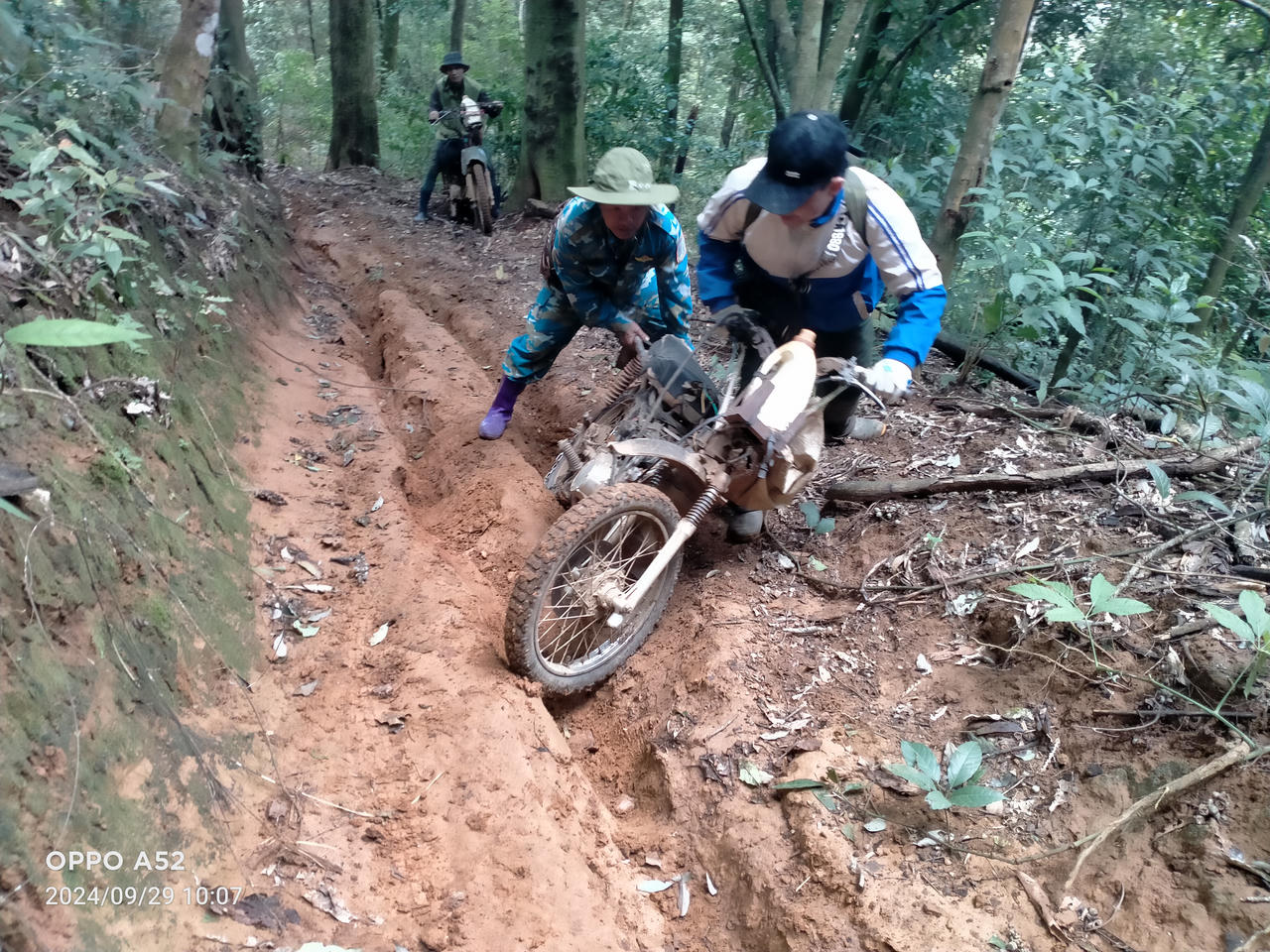 Càng đi sâu vào rừng, địa hình càng hiểm trở. Dốc nối dốc, cua chồng cua. Mồ hôi túa ra như tắm dù tiết trời vùng cao se lạnh. Có lúc thân hình rã rời, hai cánh tay tê dại, đôi chân run lên vì mệt. Ý nghĩ bỏ cuộc thoáng vụt qua trong đầu khi phải liên tục dắt xe vượt suối, đẩy xe qua những bãi đá trơn như bôi mỡ.